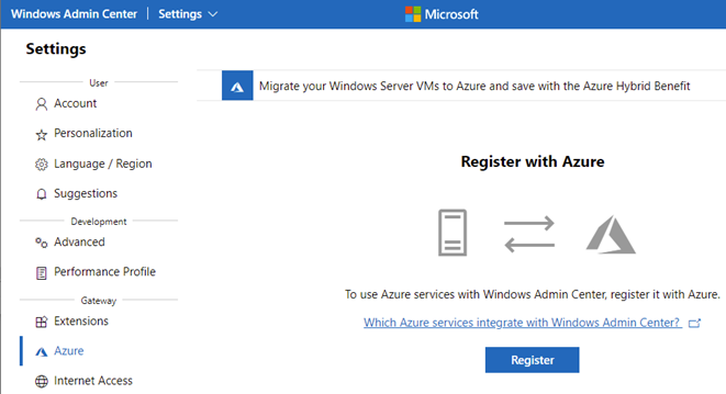 Windows Admin Center’a erişim sağlandıktan sonra ilk yapılması gereken işlem, yönetim konsolunu Azure’a bağlamaktır. Ayarlar sayfasından Azure kayıt işlemini gerçekleştirebilirsiniz.
